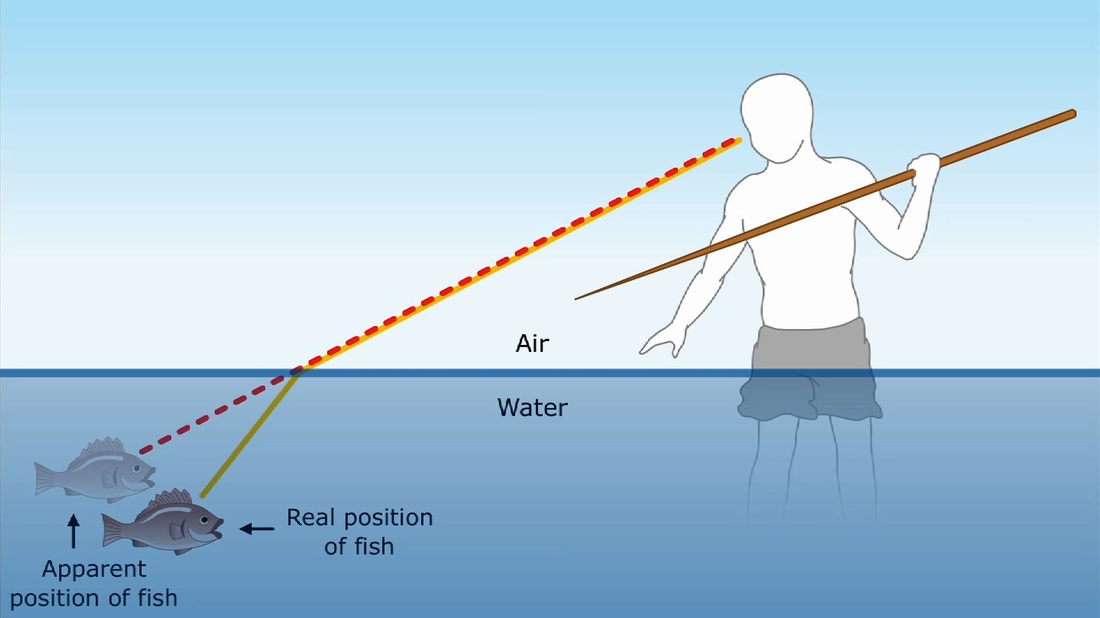 When those waves go through materials like glass, they slow down. Their speed is c/n, where n is typically > 1 and is called the index of refraction. When a light wave hits a surface at an angle, this decrease in speed leads also to a change in angle. You know this intuitively, just like people thousands of years ago did. You know as you look into water, the things you see under the surface of the water are a little bit deeper and closer to you than they look.